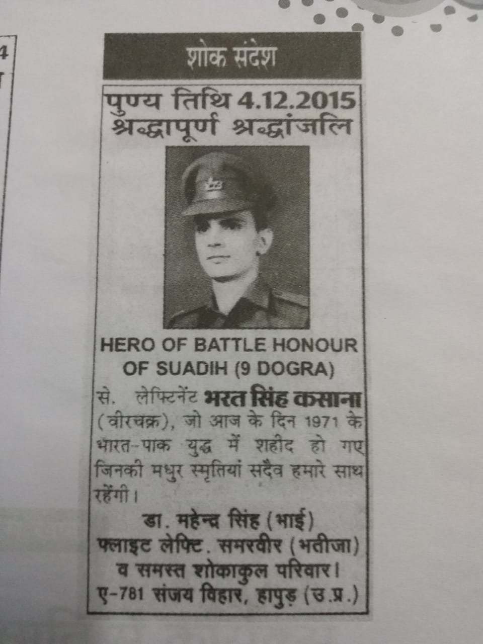 2nd Lt Bharat Singh Kasana is survived by his wife, Smt Nirmal Kasana.