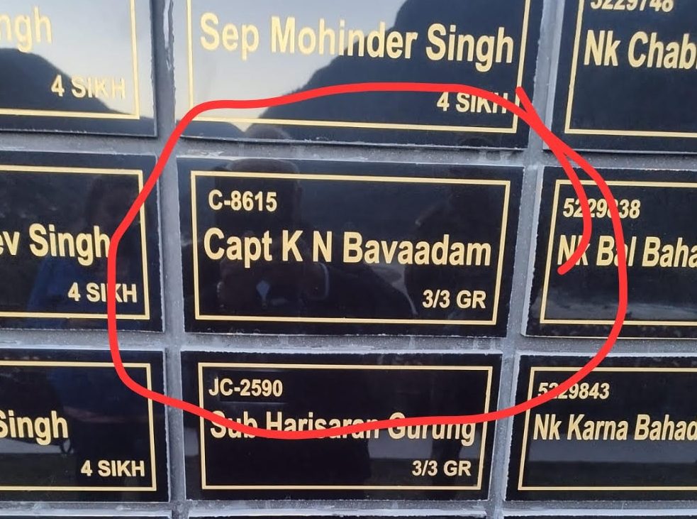 When the Chinese launched large-scale assaults on Sikh and Gorkha positions, D Company was one of the last organised groups still offering resistance west of the Lohit River. Captain Bavaadam kept his men steady, fought off two enemy attacks, and maintained strict fire discipline even as ammunition ran low. Under his command, soldiers like Naik Keshar Bahadur Gurung and Havildar Chandra Bahadur Pun displayed exceptional bravery, continuing to fight until they fell. When communications with battalion and brigade headquarters were cut, Captain Bavaadam took full responsibility for his isolated company, making tactical decisions under extreme pressure. He personally led the evacuation of the wounded, including carrying out Major Samatsar of 4 Sikh, despite heavy enemy fire. As the Chinese began to outflank and surround them, he attempted a fighting withdrawal to save as many of his troops as possible. During this movement, the company was ambushed by Chinese elements that had slipped behind Indian lines. Captain Bavaadam continued to direct the fight, covering his men and refusing to leave his position. In this fierce rearguard action, Captain KN Bavaadam was "Killed in Action", sacrificing his life while ensuring that his soldiers had a chance to break out.