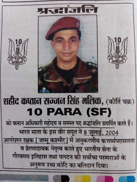 Capt Sajjan Singh Malik hailed from Kirtan village in Rajgarh tehsil of Churu district in Rajasthan and was born on 25 Nov 1979. He was born into a family with a strong military tradition and grew up deeply influenced by his father's discipline and dedication, who served in the Jat Regiment of the Indian Army. From an early age, this exposure to the values of duty, courage, and patriotism shaped his character and inspired him to pursue a career in the armed forces. To begin his journey toward military service, he was enrolled at the prestigious Rashtriya Military School, Belgaum. The institution is well known for grooming young boys into future leaders of the armed forces through a balanced combination of academics, discipline, and military-oriented training. The structured and demanding environment of the school instilled in him important soldierly qualities such as leadership, resilience, physical endurance, and a strong sense of responsibility. His formative years at the military school laid a strong foundation for his future career in the Army. Motivated by his ambition to serve the nation, he went on to join the National Defence Academy, India’s premier tri-services training institution. At the academy, he underwent rigorous academic, physical, and military training alongside cadets from the Army, Navy, and Air Force. The demanding training environment further sharpened his leadership abilities, mental toughness, and commitment to the profession of arms. After successfully completing his training at the NDA, he proceeded to the Indian Military Academy in Dehradun, where he received advanced military training before being commissioned as an officer in the Indian Army.