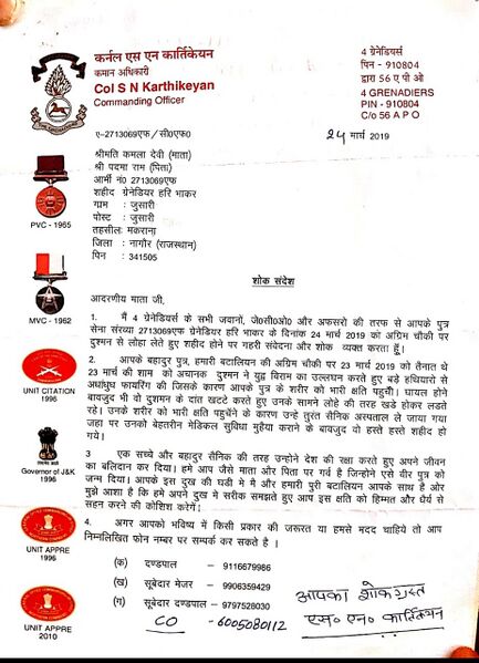Grenadier Hari Bhakar is survived by his father, Shri Padma Ram Bhakar, and mother, Smt. Kamla Devi, his sister Smt. Manoja Devi and his twin brother Shri Harendra Bhakar, who continues the family’s proud tradition of service as a soldier in the 17th Grenadiers Battalion. Grenadier Hari Bhakar's sacrifice remains a source of pride and inspiration for his family, his regiment, and the nation.