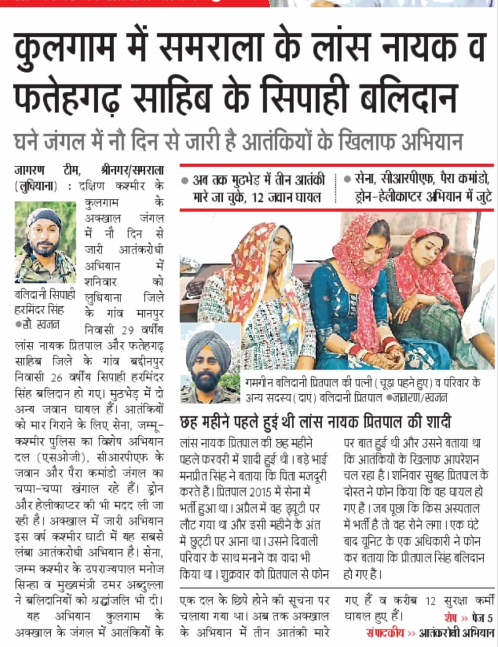 Lance Naik Pritpal Singh is survived by his father Shri Harbans Singh, wife Smt Manpreet Kaur, sister Ms Kuldeep Kaur, elder brother Shri Harpreet Singh and younger brother Shri Gurdeep Singh.