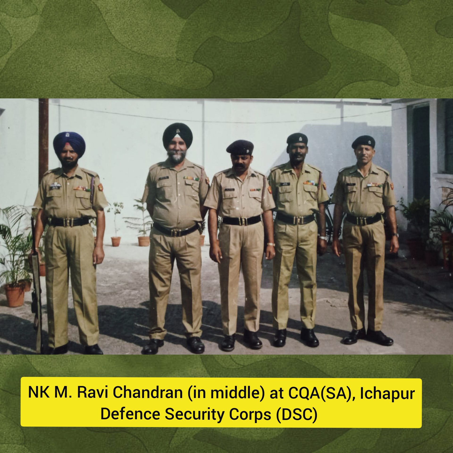 NK M. Ravi Chandran hailed from Lakshmipuram(Erichanatham) village in Virudhunagar district of Tamil Nadu and was born on 10 May 1965. Son of Shri Mariappan and Smt Lakshmi, he joined the Army at the age of 20 years. He was recruited into 116 Infantry Battalion (TA) Para in 1985 at Nasik. Post this tenure, in 1994 he was enrolled in the Defence Security Corps (DSC) at Kannur, the sixth-largest corps of Army involved in the crucial task of guarding the defence installations. During his service in DSC, he served in various field areas including some of the very challenging high altitude areas. He served in numerous defence establishments located at Udhampur (J&K), Ooty(TN), Ichapore (West Bengal), Vasco-da-Gama (Goa), Bikaner (Rajasthan), Ludhiana (Punjab), Vishakhapatnam (Andhra Pradesh), Uttarakhand, Ooty(TN), Andaman & Nicobar Islands, and Chennai (TN).