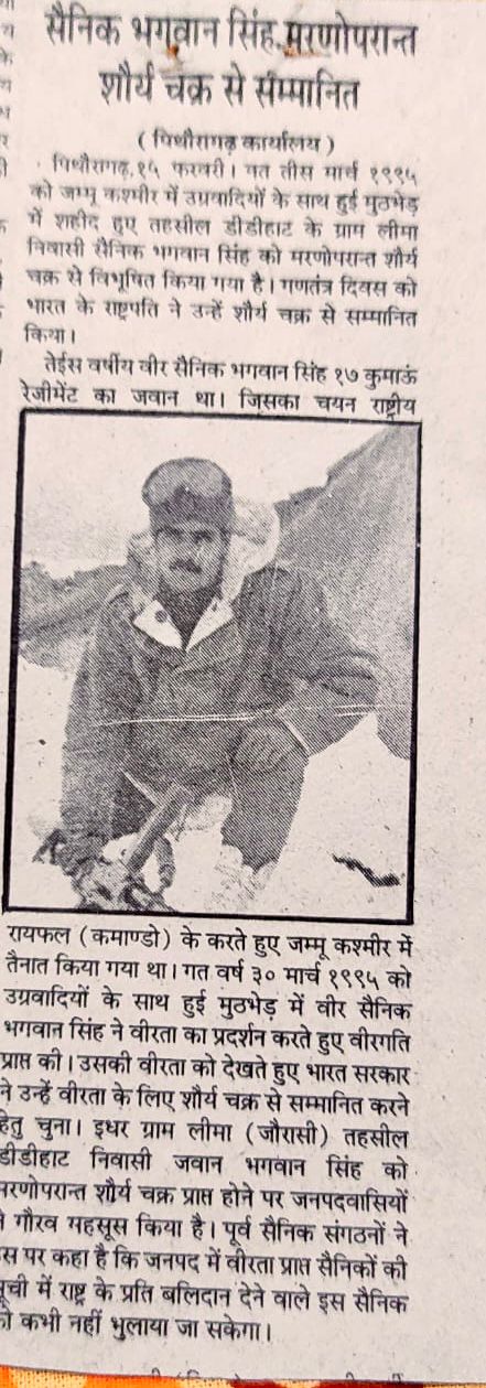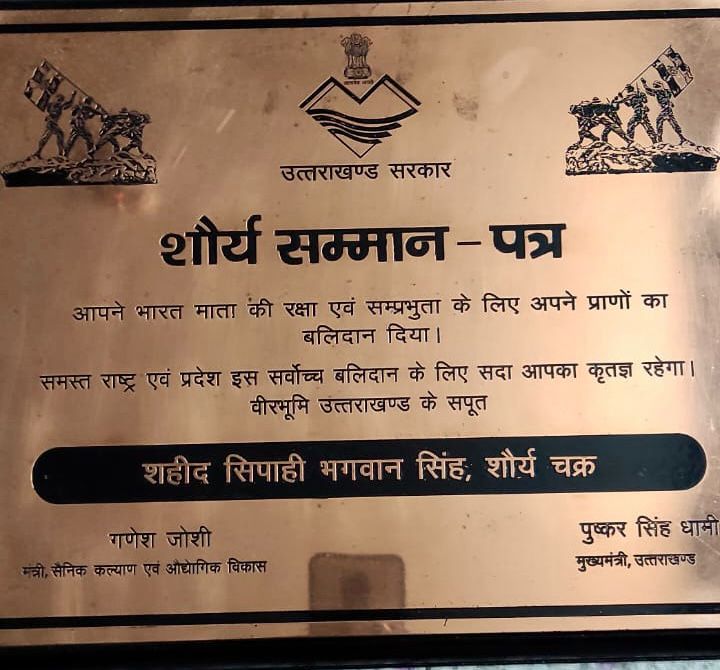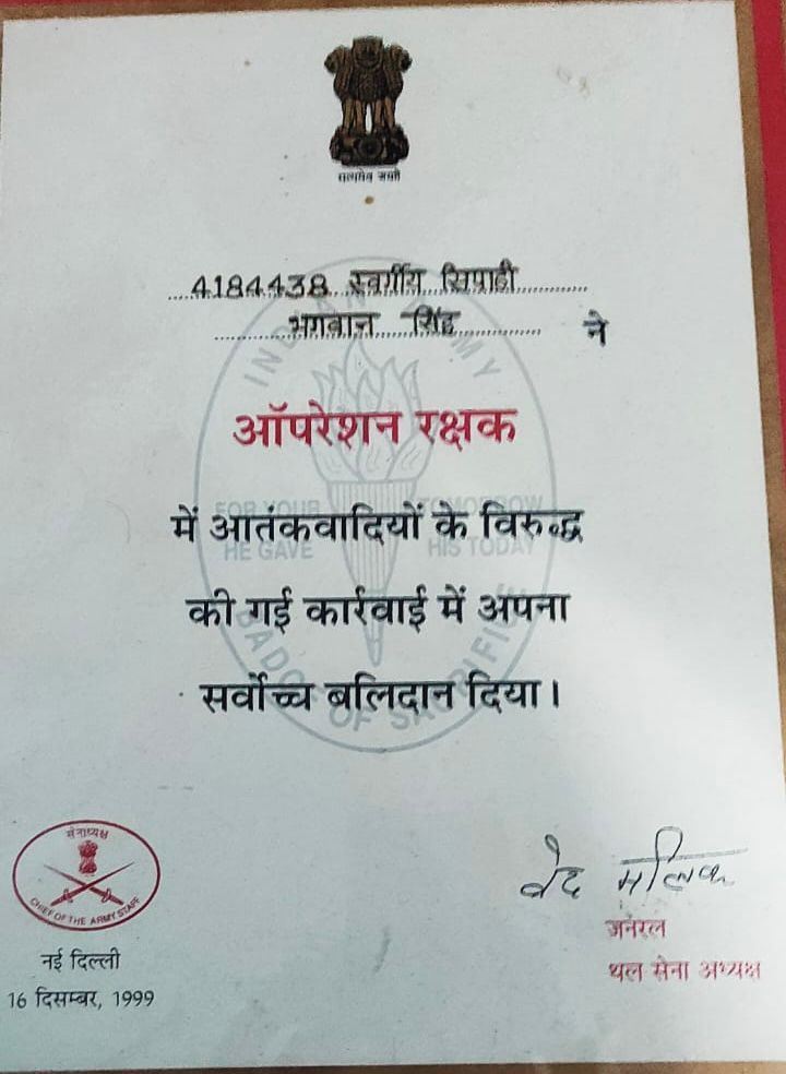 Sepoy Bhagwan Singh is survived by his mother, Smt. Rewati Devi.